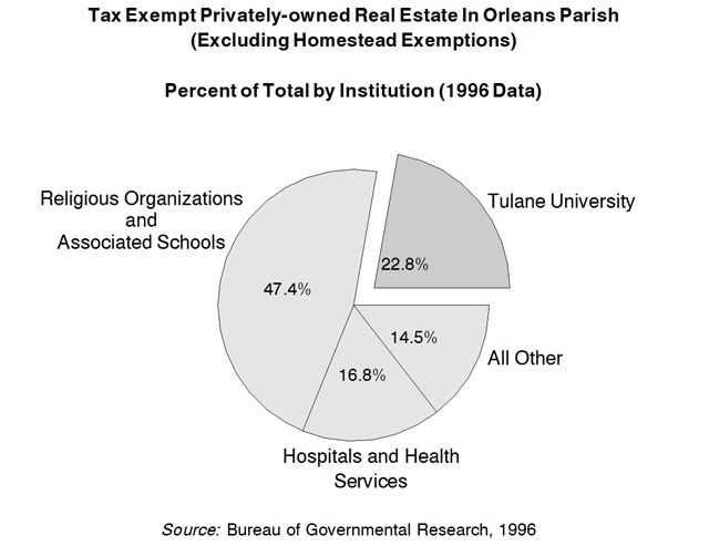 Property Taxes in Orleans ParishIn 1996, the Orleans Parish School Board received 28% of collected property taxes, the Sewerage & Water Board 14%, the Levee Board 7.4%, the City 28.5%, the Audubon Institute 2.8%, and the remainder was used to help pay off the city's bonded indebtedness [1]. Clearly, property taxes provide major support to critical city services that benefit all citizens, such as the public school system, the city's infrastructure, and the social services on which we all depend. Tulane University pays no property taxes, even on commercial holdings not used for educational purposes. In 1996, Tulane University owned or controlled 4.5% of the city's property tax base, and subsequent acquistions have only increased its share. Discounting property that is exempted through the homestead exemption, Tulane's portion of the remaining tax-exempt property in New Orleans amounted to 22.8% in 1996, as illustrated below [2]. The value of privately-owned real estate exempted from taxes in 1996 was over $501 million, of which Tulane's share was about $115 million. Because of these exemptions, the revenue lost to local government was $67.4 million, of which about $15.4 million was attributed to Tulane's exemptions [2]. Tulane receives the services of the city's police and fire departments and has its streets, sewerage and water lines maintained all at the expense of other taxpaying owners of private property. Unfortunately, the public schools are gravely impacted by the revenue lost to the parish. In the chart above, "All Other" includes (in descending order of percentage): tax abatement for restorations; other private schools; social services; trade, travel and commerce; fraternal organizations; housing development corporations; cemeteries; manufacturing; labor unions; foundations; and miscellaneous others [2]. The Contest to Collect the Tax In 1996, 5th Municipal District Assessor Thomas L. Arnold billed Tulane for taxes on undeveloped land valued at $8.1 million near English Turn on the West Bank, arguing that Tulane was holding the property as a commercial investment taxable under state law. Arnold pointed out that non-profits increasingly were investing in commercial properties and freeing them from taxation [3]. They would then lease the property back to the original owners for less than the owners were paying in taxes and use the rental income for their own purposes. It is a scheme that deprived the city of needed tax revenue. "This is a cancer that's growing, and if we don't do something about it, we all lose," Arnold remarked. [3] Tulane responded by suing the Tax Commission in state court which returned the favorable ruling that, because there was no constitutional provision requiring the taxation of property held for commercial purposes by nonprofit educational associations, Tulane remained exempt [4]. Extrapolating from that extraordinary bent of judgment, one can argue that the absence of a constitutional provision requiring a penalty for a specific type of activity gives one license to freely engage in that activity, even if there is legislation that penalizes it. What Arnold may not have realized at the time was the degree to which the courts were biased in favor of Tulane. Thus, the civil district court judge who issued the favorable ruling, Judge Robin Giarrusso, was a Tulane undergraduate who also received her law degree from Tulane Law School and served as a frequent lecturer [5]. More importantly, when Arnold appealed the judgment to Louisiana's 4th Circuit Court of Appeal, the three judges assigned to the case Judges Patricia R. Murray, Joan Armstrong, and Moon Landrieu [6] all had substantial conflicts of interest because of direct or family ties to Tulane. Coincidentally, these were the same appellate judges that had been assigned to review the lawsuit that Dr. Stephen Schwarz had brought against Tulane. Appellate Judge Patricia R. Murray received both her BA and JD degrees from Tulane and from 1994 onward held an adjunct appointment at Tulane Law School as an associate professor, teaching in the course Trial Advocacy [7]. Moreover, as a student in the early 1980's, Murray was the recipient of a number of Tulane scholarships. As reported in the Oct. 15, 1995 issue of The Times-Picayune, she received three years of scholarships via Henry Braden [8] and another year of scholarship via Michael O'Keefe [9]. At today's tuition rates, those would be valued at more than $130,000, an indebtedness that would appear to make her recusal mandatory [10]. The other judges involved in Arnold's appeal against Tulane were Judges Joan Armstrong and Moon Landrieu, whose families also benefited from Tulane scholarships. According to The Times-Picayune, Anna Armstrong, a daughter of Judge Armstrong, received a Tulane scholarship for the 1992-93 academic year [11], Gary Landrieu, a nephew of Judge Landrieu, received Tulane scholarships from 1976 to 1981 [12], and Sherri Dazet Landrieu, a daughter-in-law, received Tulane scholarships from 1983 to 1985 and the 1986-87 academic year [13]. It is a matter of conjecture whether Arnold was even aware of the judicial conflicts of interest that permeated the appellate process in his attempt to tax Tulane for its commercial property interest. Perhaps that knowledge would have influenced his strategy in pursuing a matter that is vital to the welfare of citizens whose futures are tied to the quality of public education and other important services provided by parish government. In 2004, the financial crisis at the University of New Orleans was serious enough to force the closing of the student newspaper, Driftwood [14]. In 2004, Tulane listed the value of its investments in partnerships, mortgages, real estate and royalty interests at $77 million [15].In 2005, Rep. Jeff Arnold, D-Algiers (Thomas L. Arnold's son), and Sen. Ann Duplessis, D-New Orleans, introduced legislation that would end the taxation of motor vehicles and impose taxes on property o